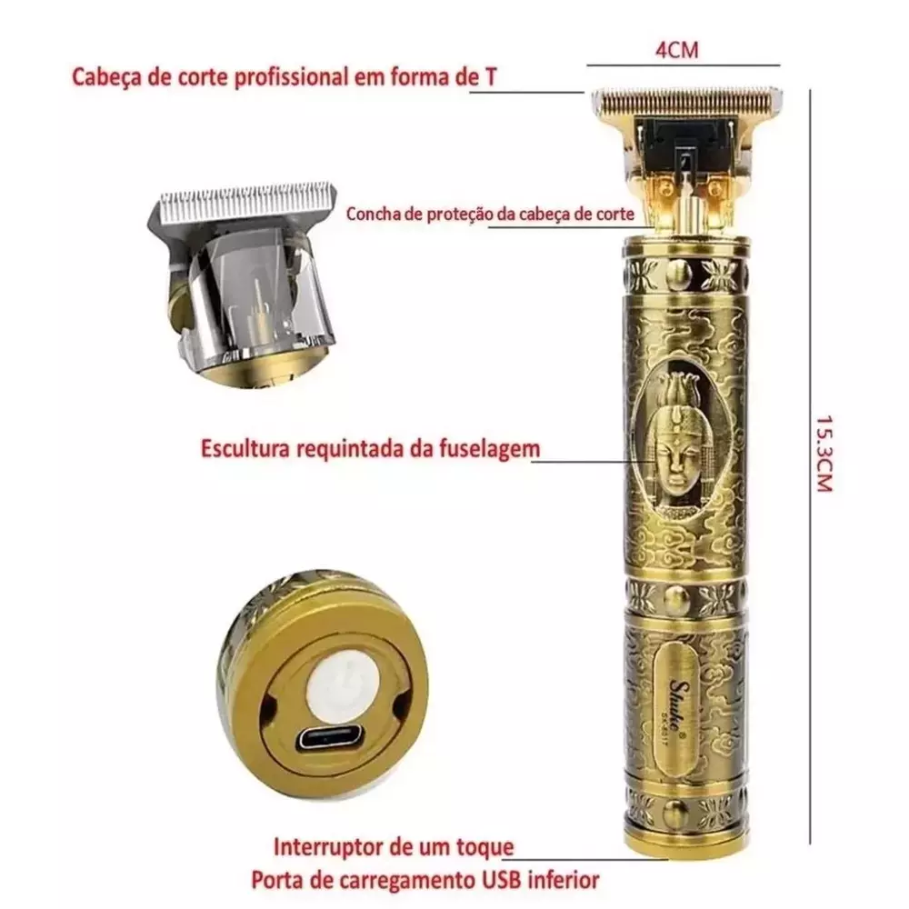 Barbeador Aparador elétrico recarregável para cabelo e barba com pentes para regulagem de altura Modelo: Shuke-8017 Buda, águia e dragão Aparador e finalizador de cabelo e barba, com bateria recarregável Aparelho muito bonito e fácil de utilizar. Possui 4 pentes de alturas diferentes (1,5mm, 2mm, 3mm, 4mm) Escova de limpeza e óleo lubrificador Acompanha cabo carregador usb/type c. A bateria pode ser recarregada utilizando um carregador de 5v com porta usb (não incluído). Mais segurança e conveniência Não precisa remover a bateria para recarregar. Tempo de carregamento de 3 a 4 horas Mantem o funcionamento or até 120 minutos imagem meramente ilustrativa